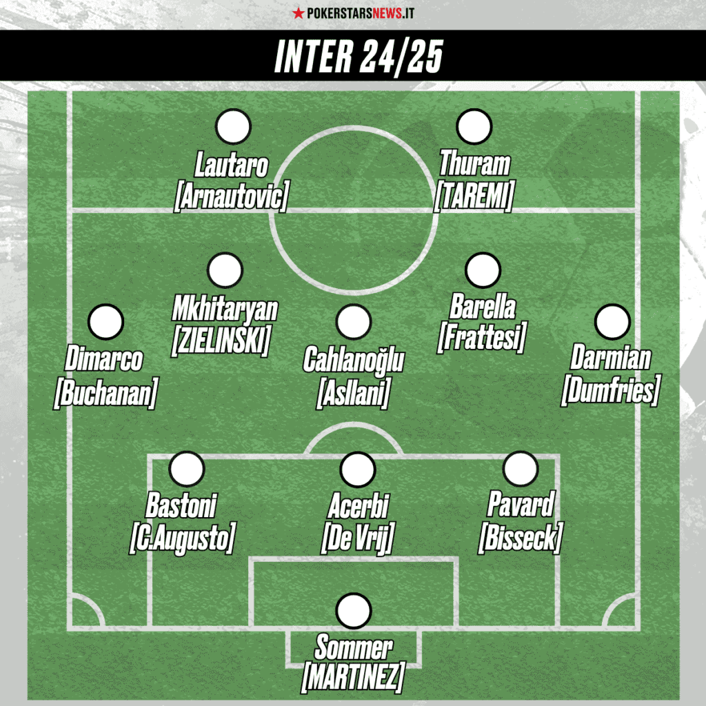 Inter 20242025 la formazione dei Campioni bistellati PokerStars News , 36 darmian, 23 barella, 20 calhanoglu, 22 mkhitaryan, 32 dimarco;